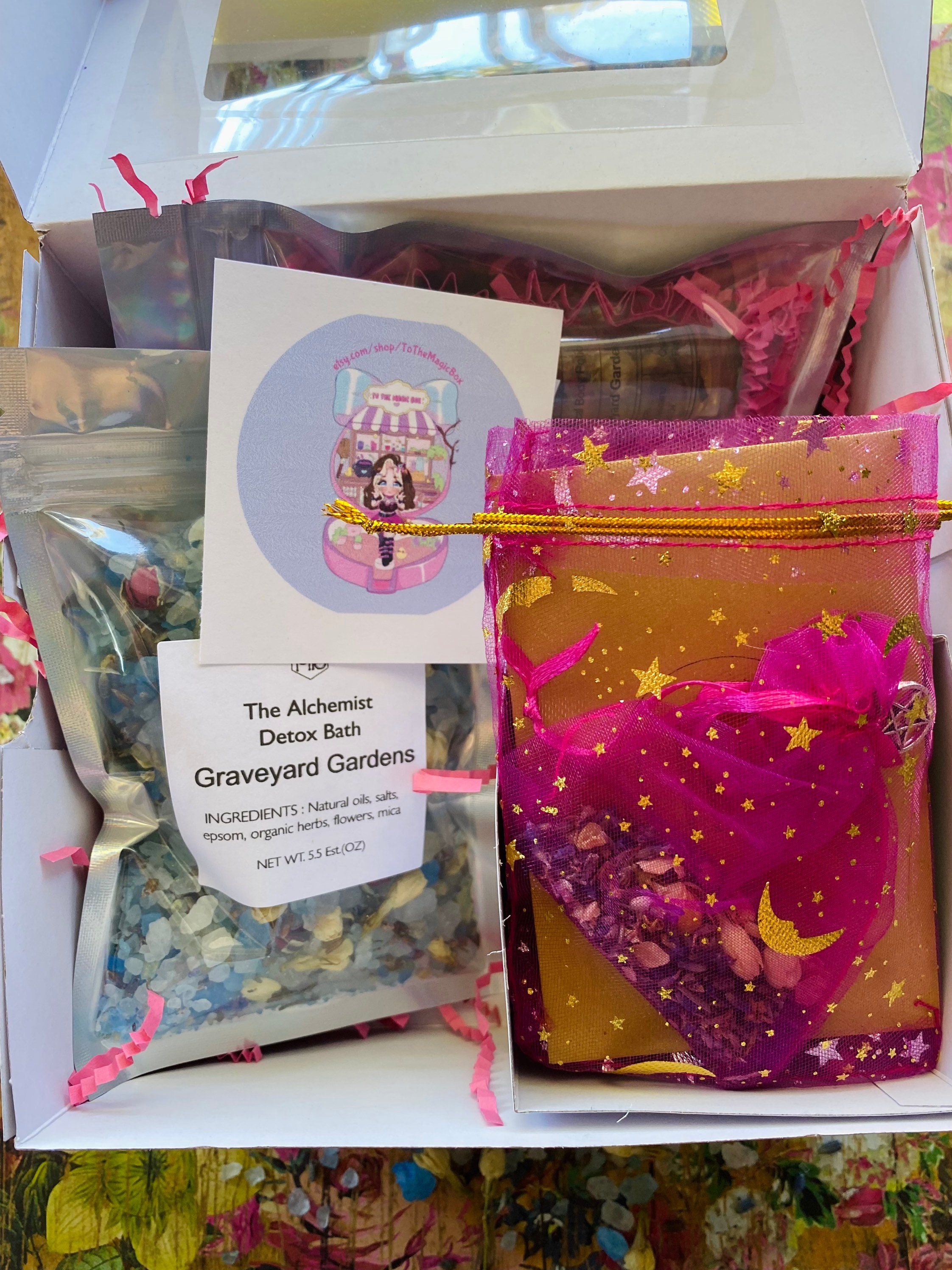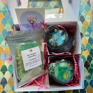 This box contains: 1 Heart Bath Bomb 1 Body Potion 1 Alchemists Detox Bath