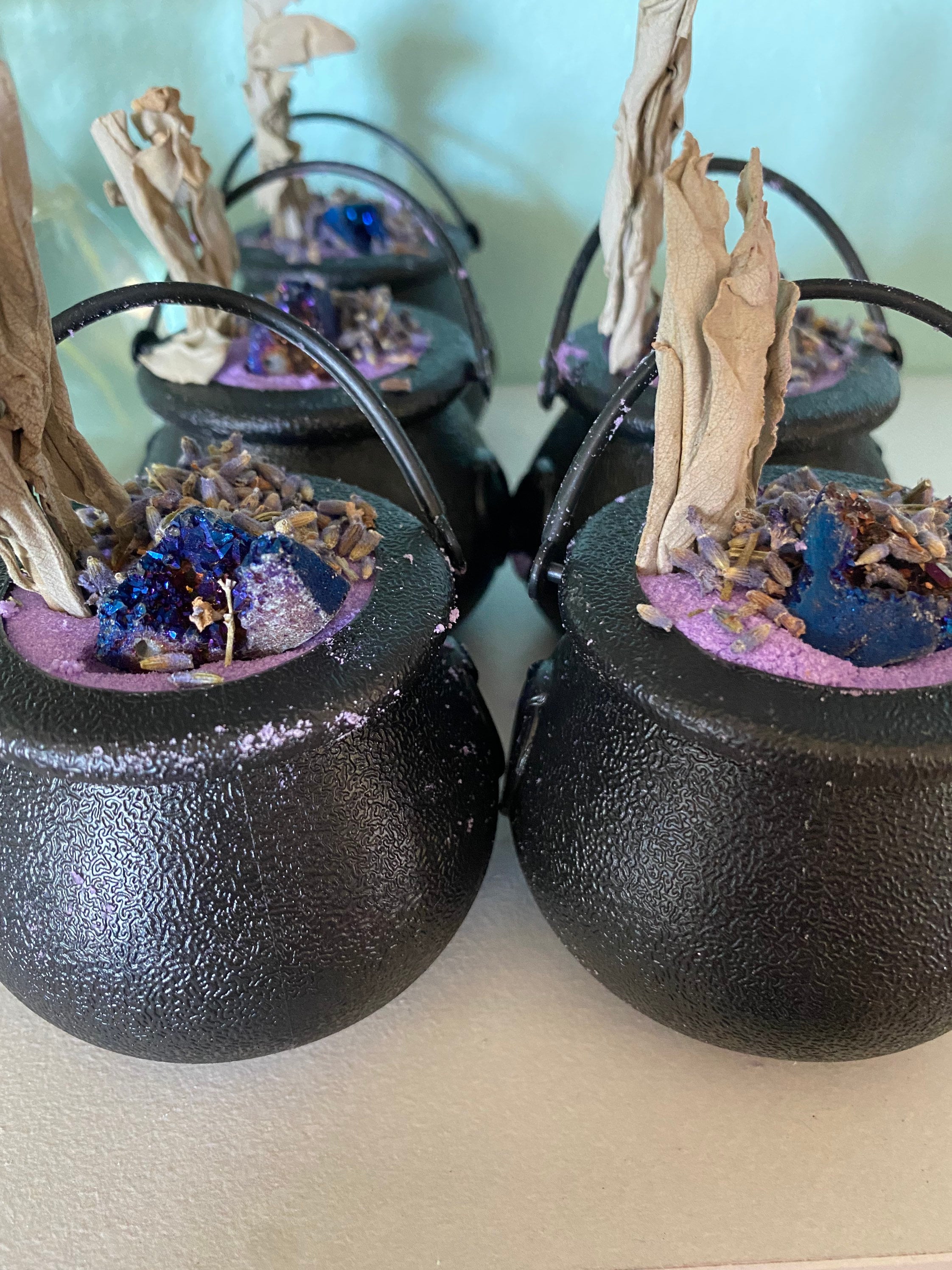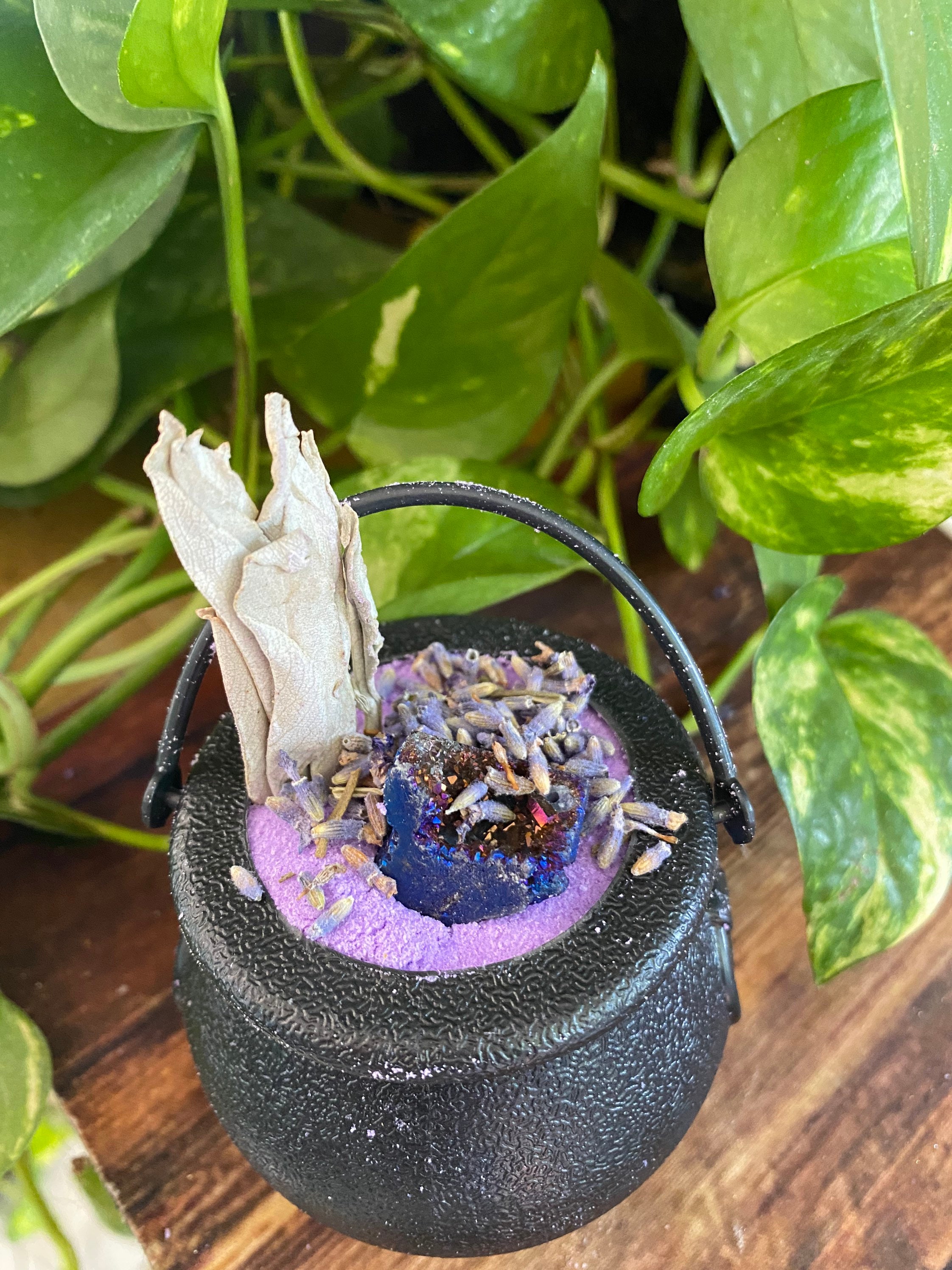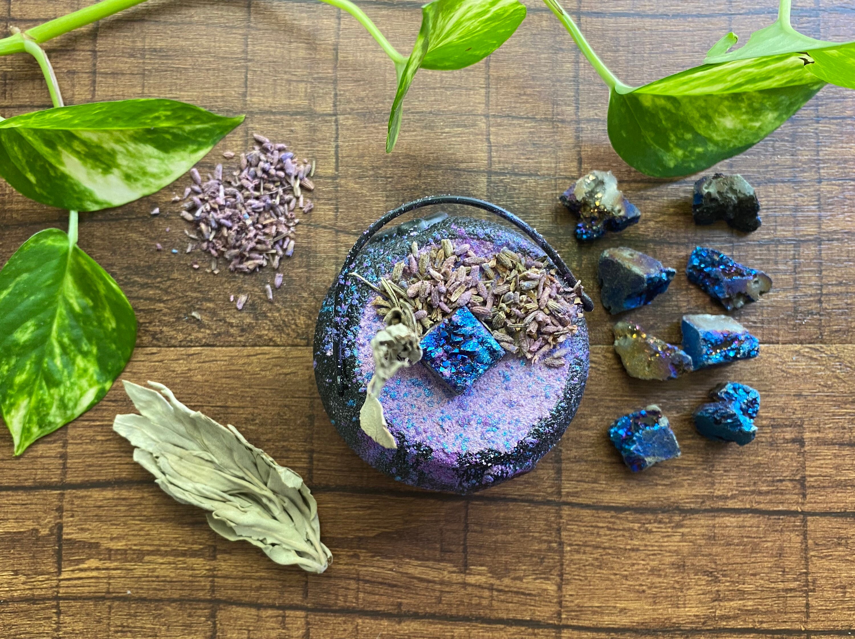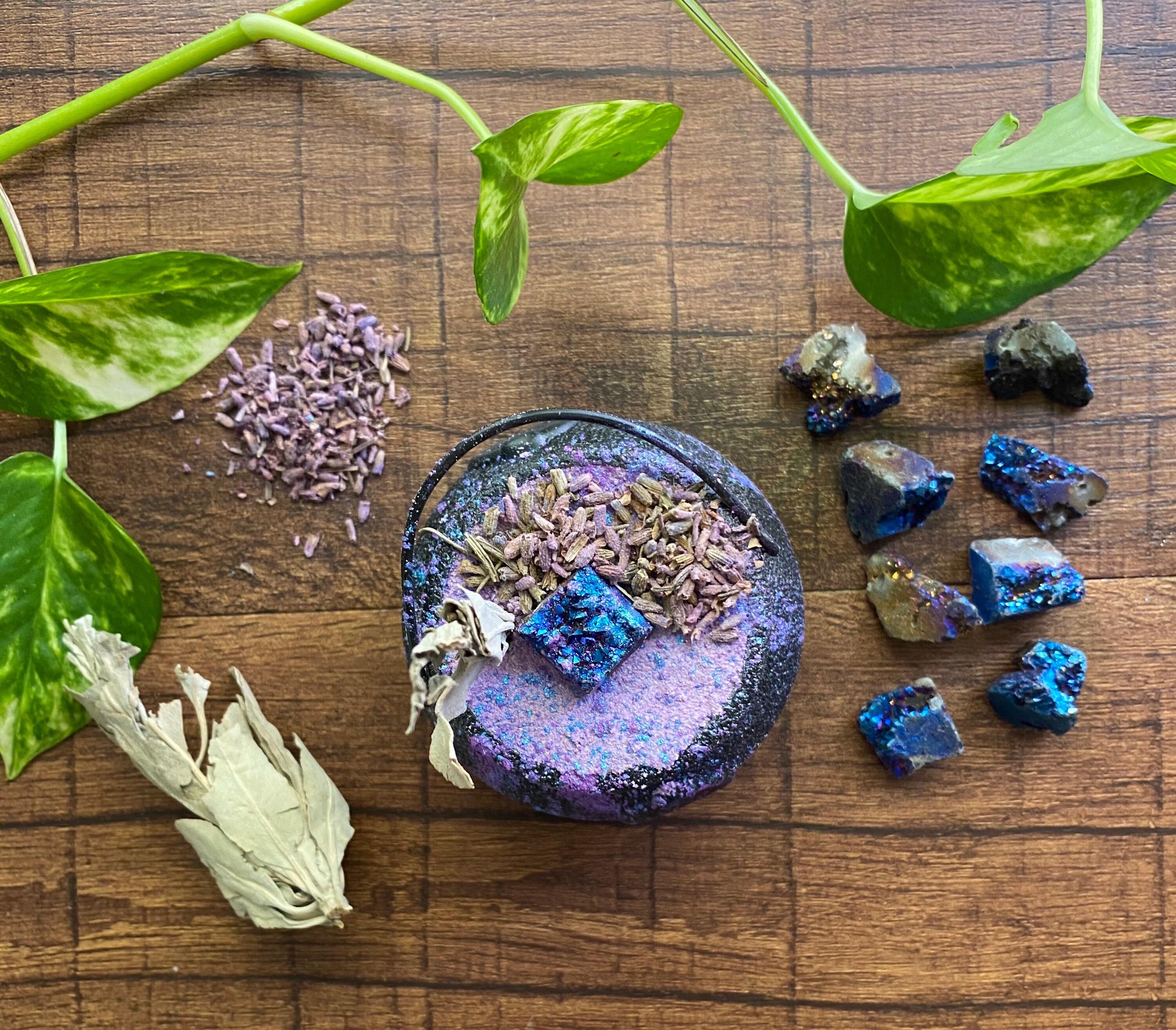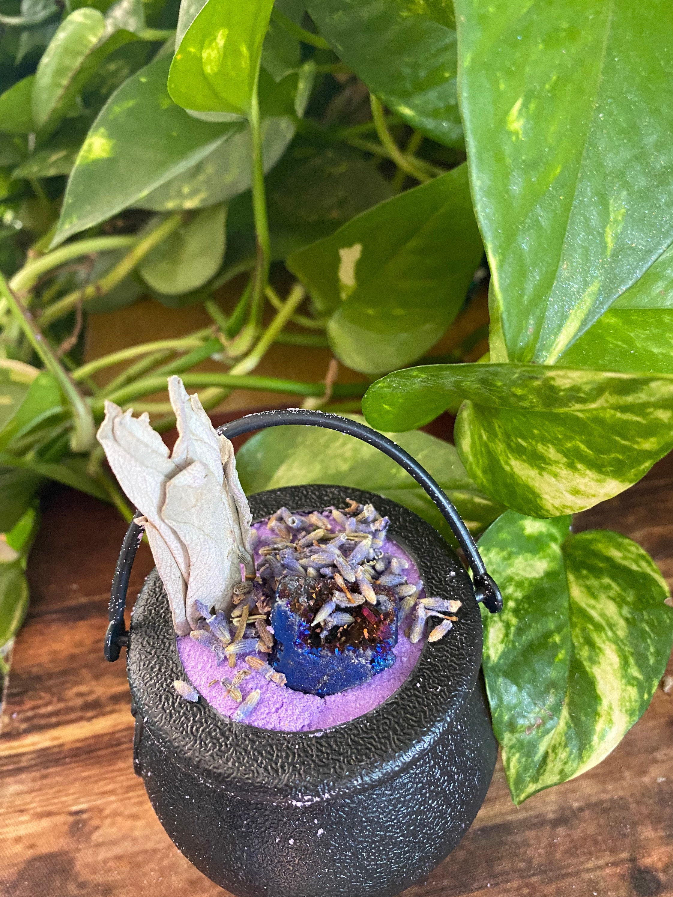 ⸻ 🧂 What’s Inside: • Purple mica-infused bath bomb base • Topped with dried lavender buds & whole sage leaf • Blue agate crystal for tranquility and inner peace • Reusable plastic cauldron • Mineral-rich salts + natural oils for soft, nourished skin