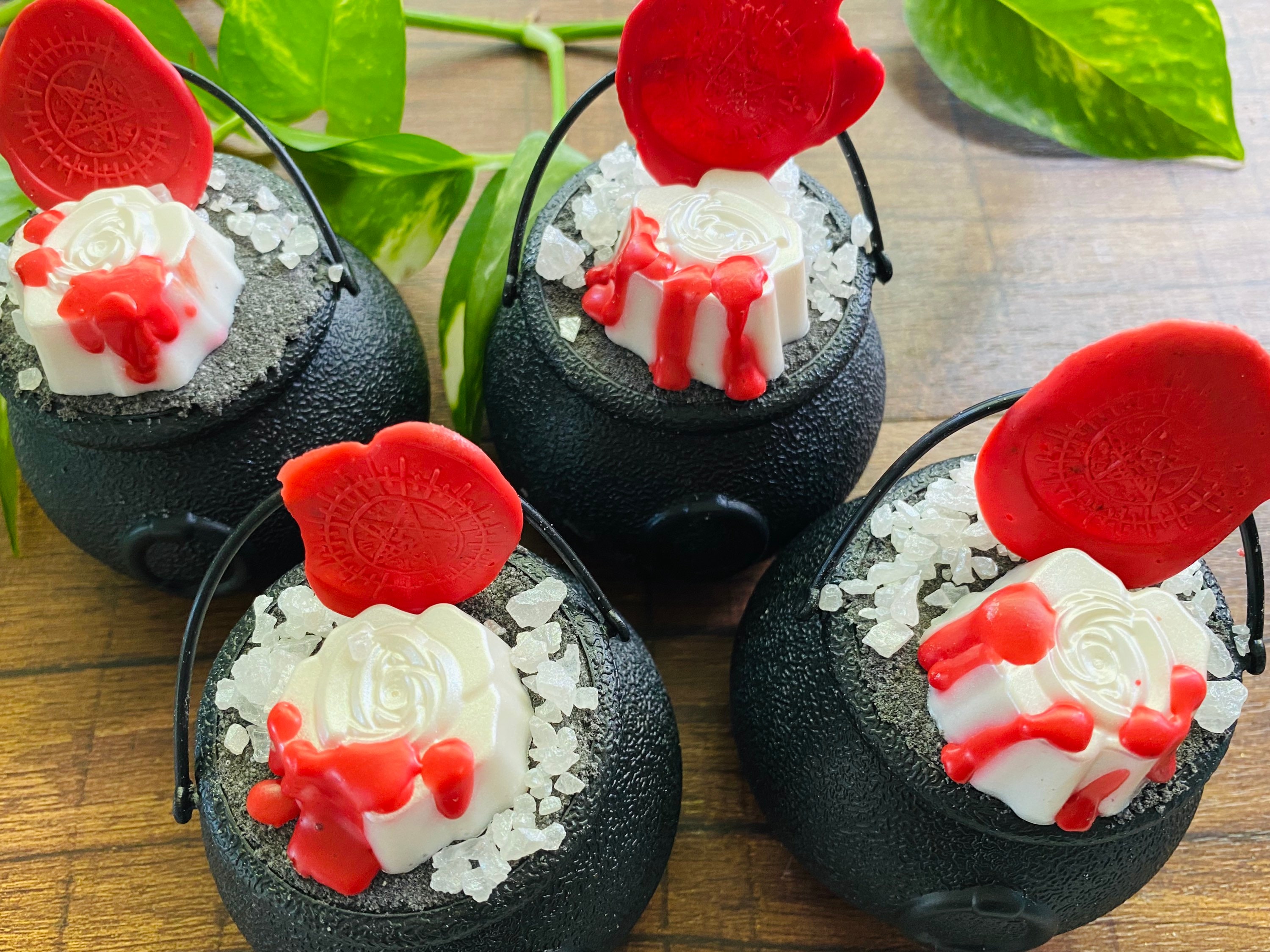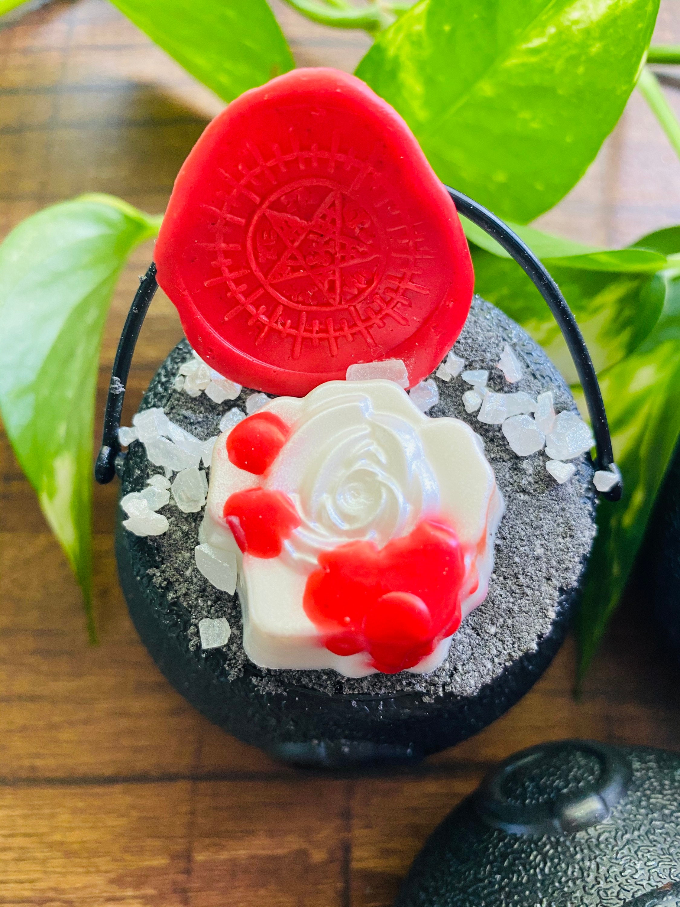 A red soap demon seal, referencing contracts with dark forces A white rose to symbolize nobility, silence, and purity Pearl mica rock salts, representing snow and ritual cleansing 🖤 Scent: Delicate white tea — clean, smooth, and otherworldly 🖤 Color: Deep charcoal black, with swirling silvery shimmer