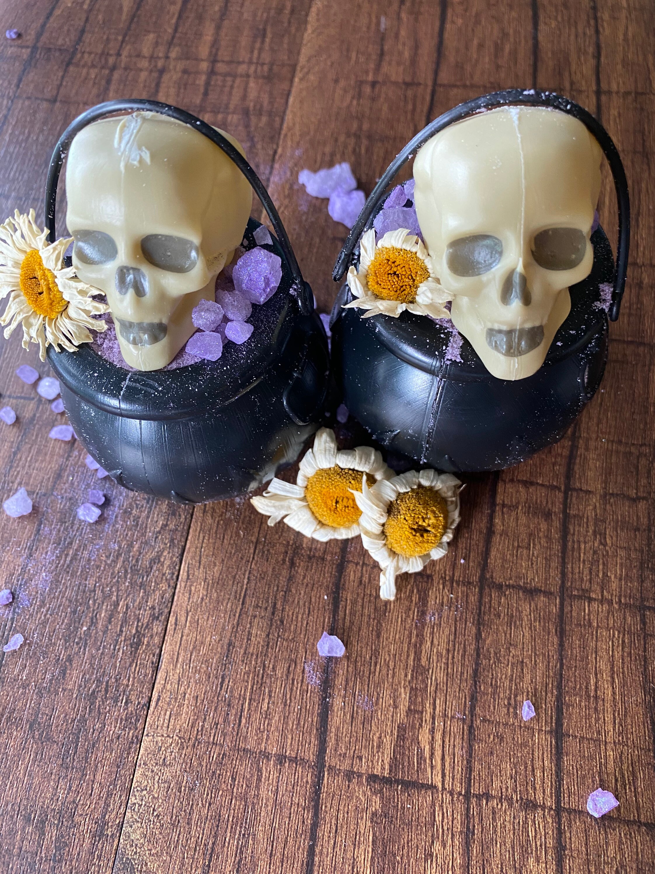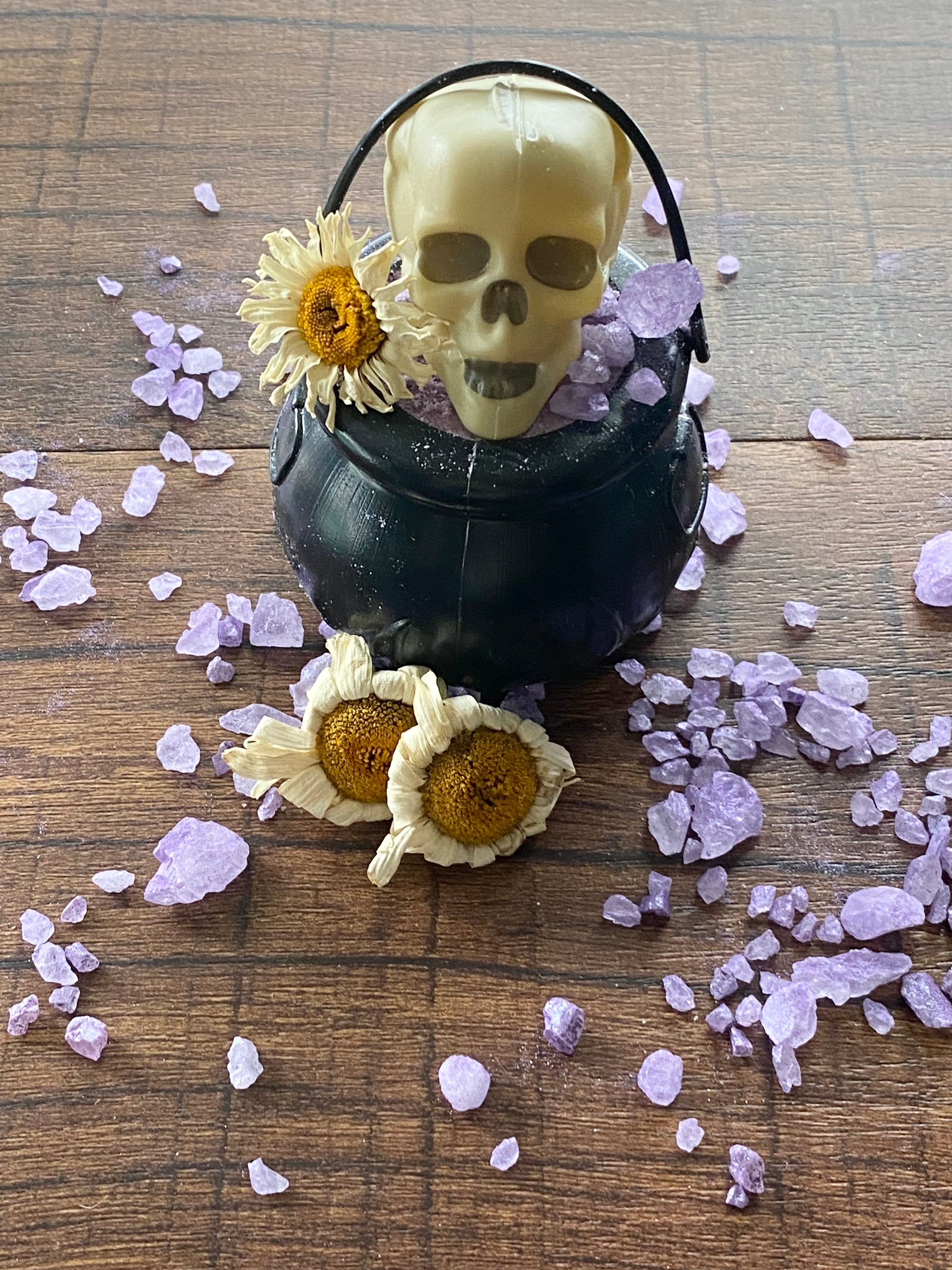 🌼 Topped with a Daisy Bloom – for beauty, lightness, and rebirth 💎 Purple Rock Salts – for grounding and visual magic 💀 Plastic Skull Accent – because death is part of the ritual 🌼 Scented like Fresh Daisies – sweet, soft, and nostalgic