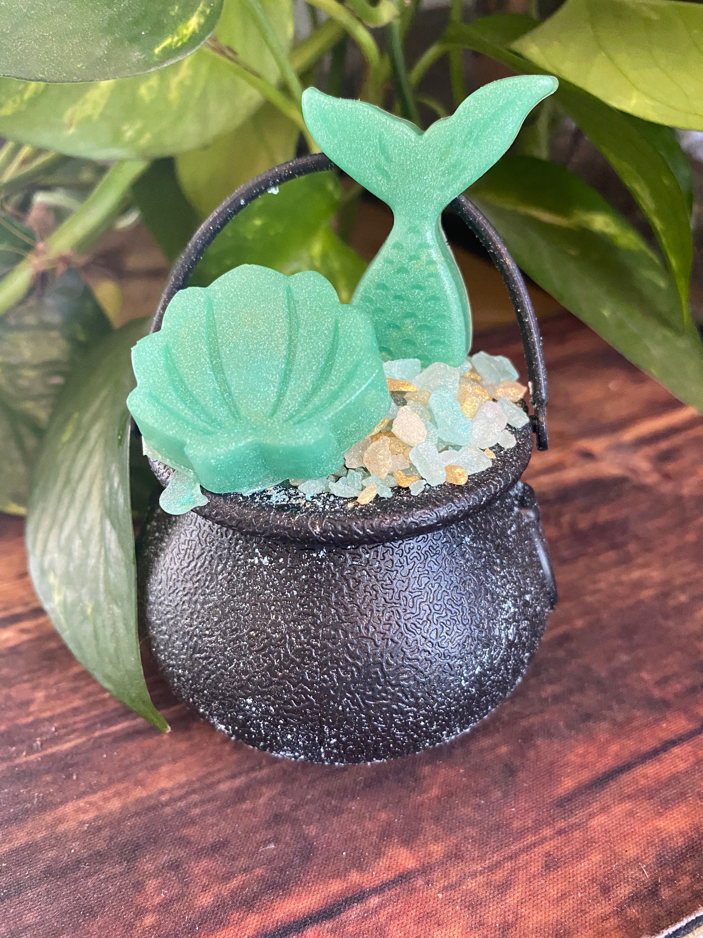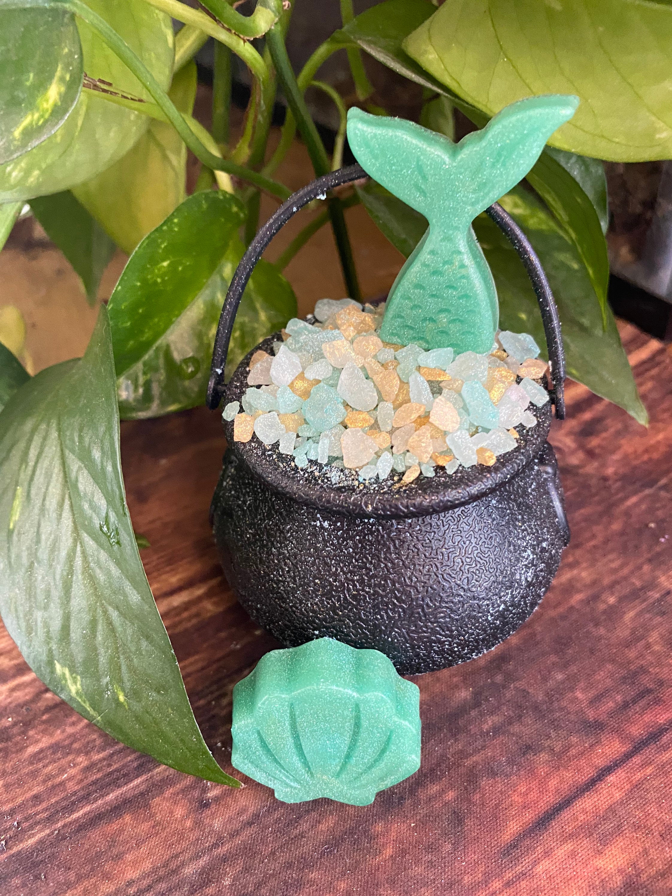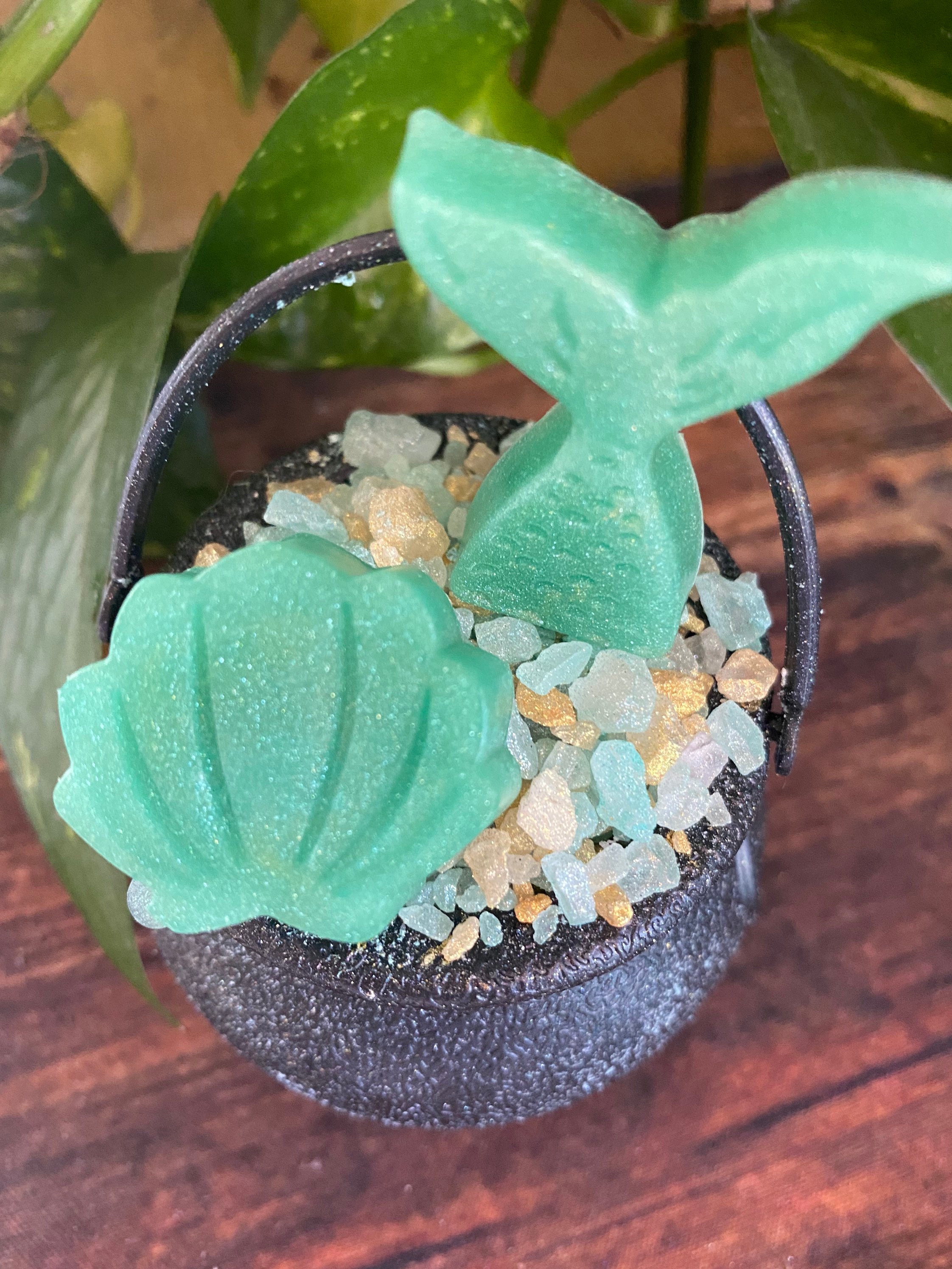 💙 Half Bath Bomb + Half Salt Soak – For a soft, skin-loving soak with fizz and therapeutic minerals 🧂 Topped with Chunky Rock Salts – Mineral-rich and beautiful 🐚 Finished with a Mermaid Tail Soap + Real Shell Accent – Because the sea is full of treasures