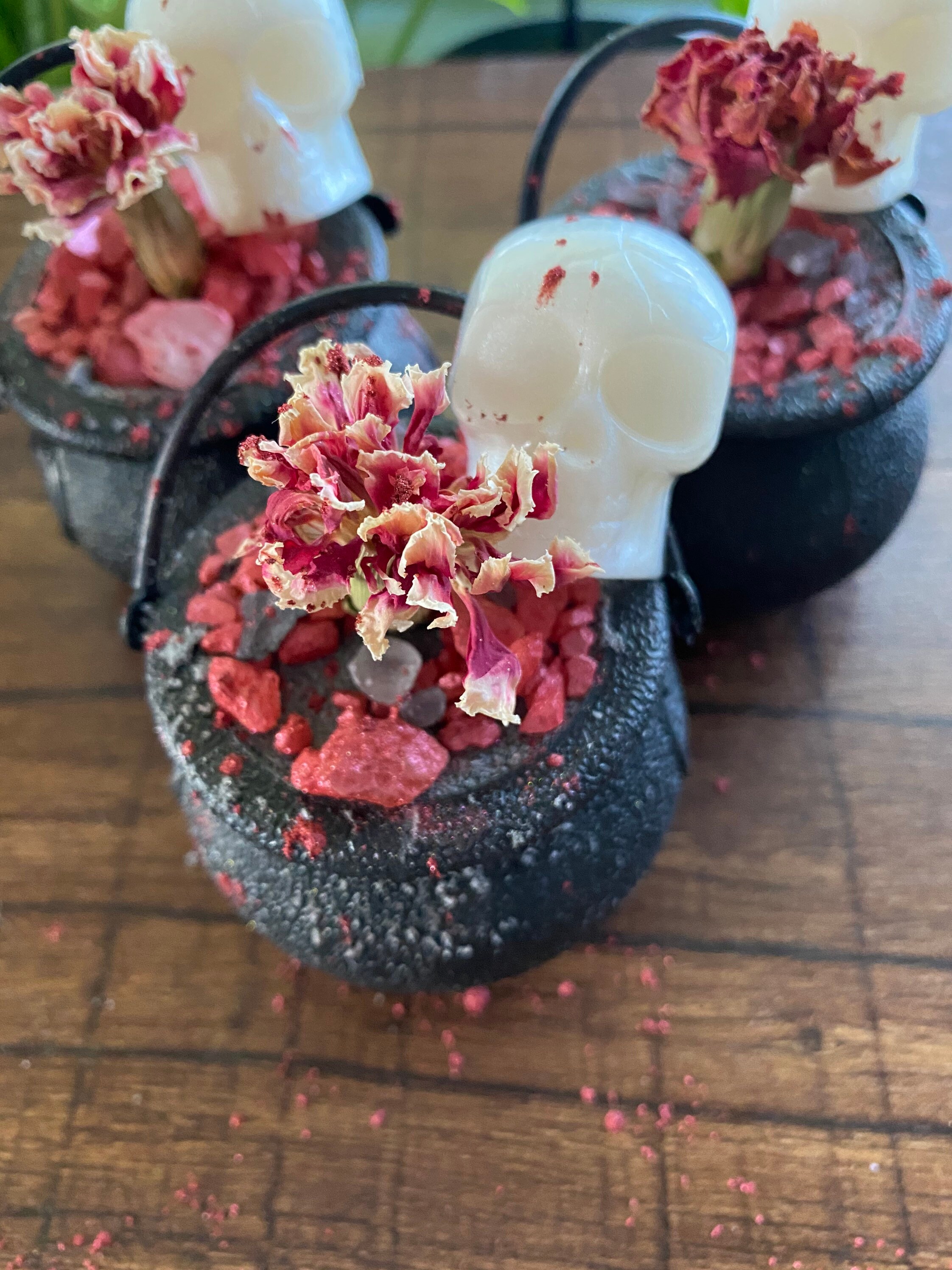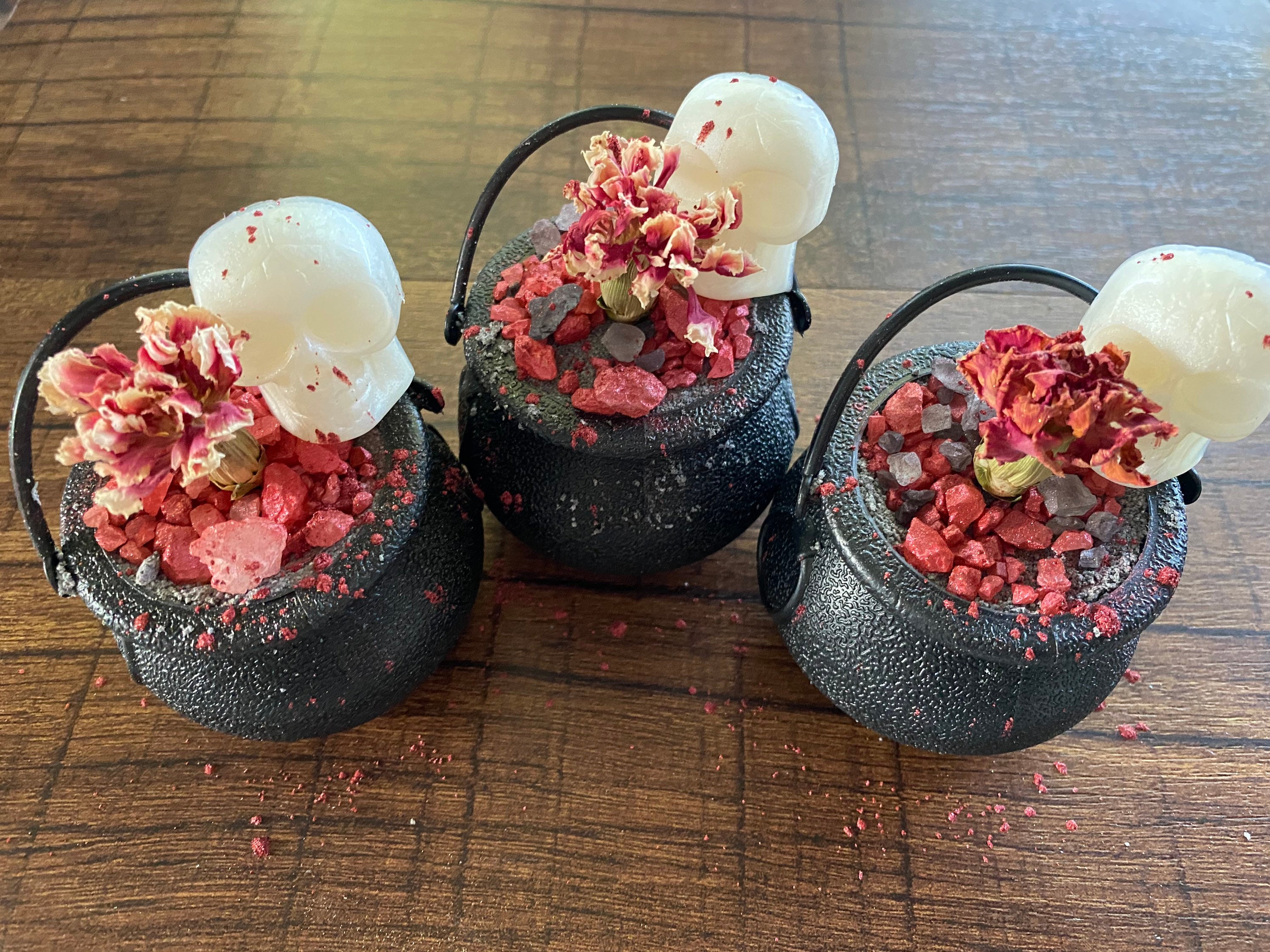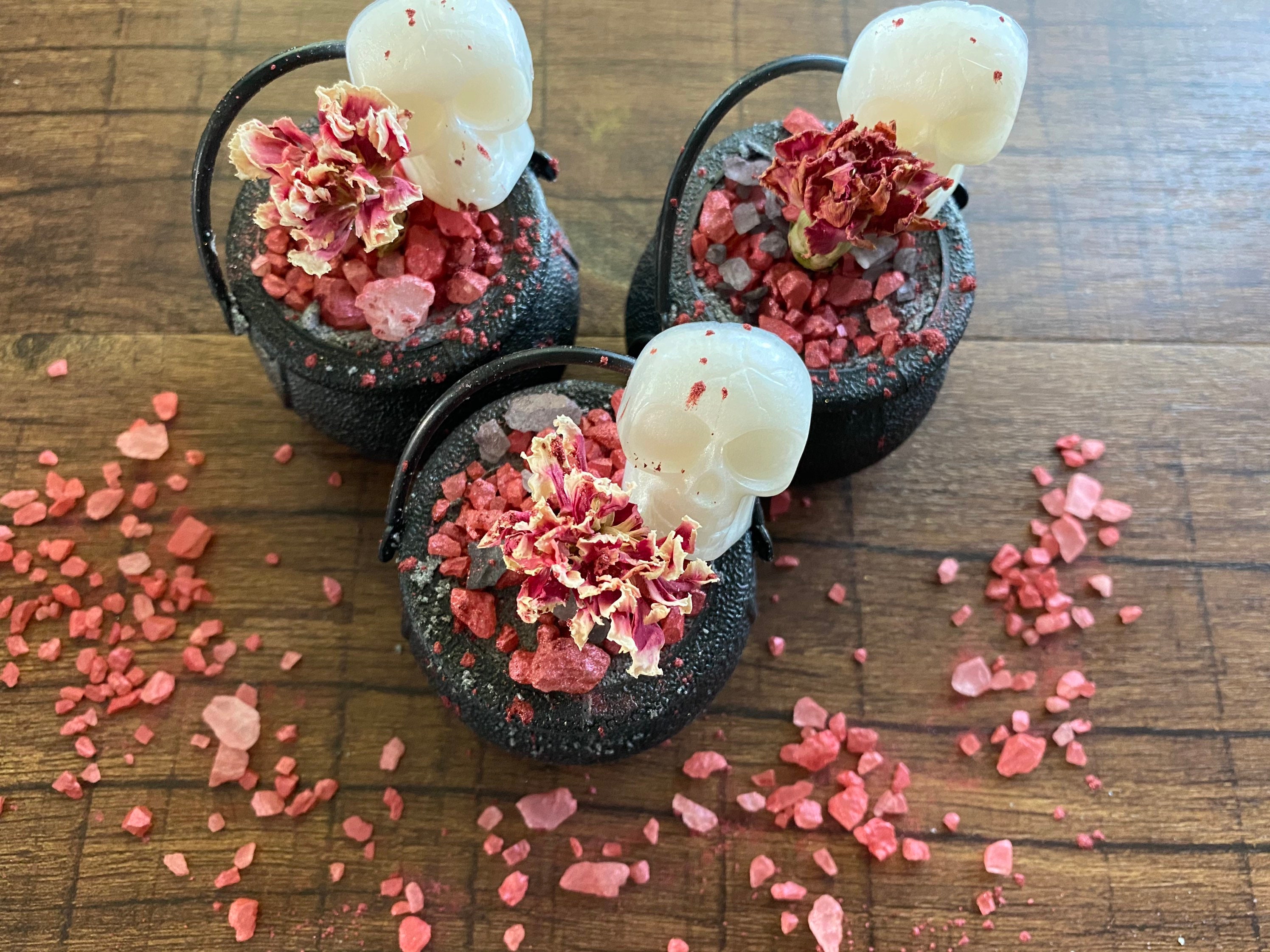 Sleepy Hollow mini cauldron bath bombs are made with active charcoal, rock salts, and topped with a carnation.