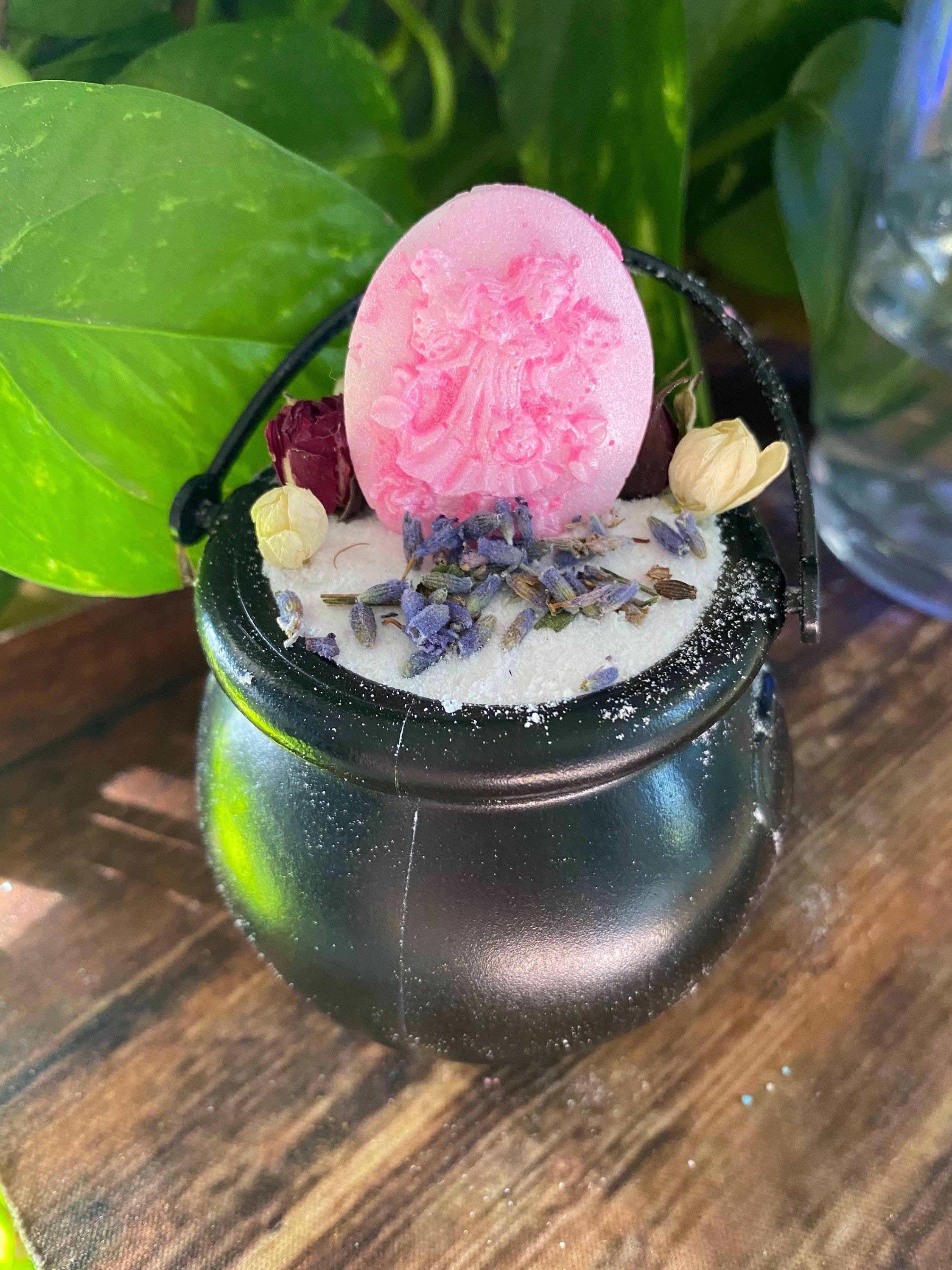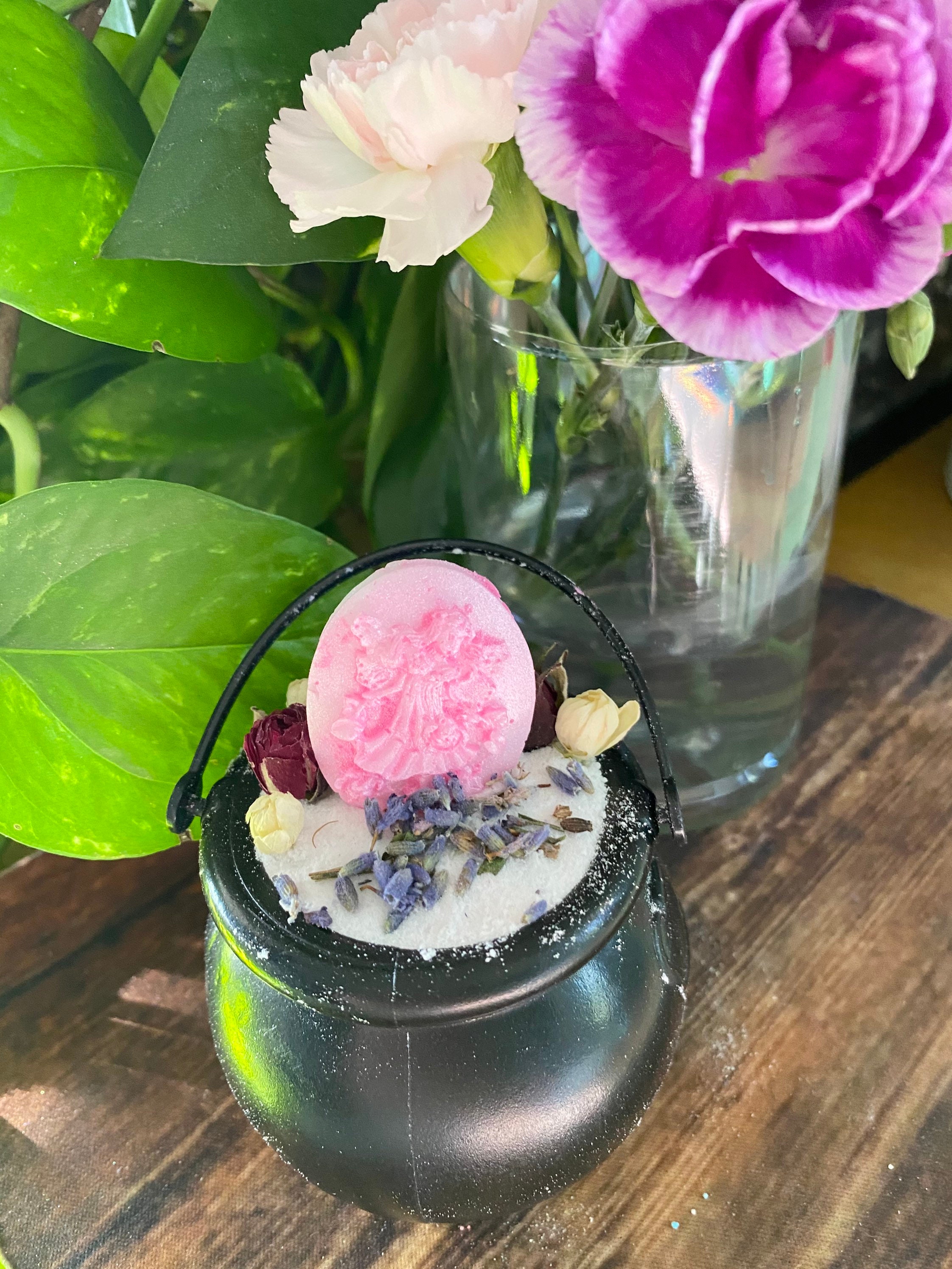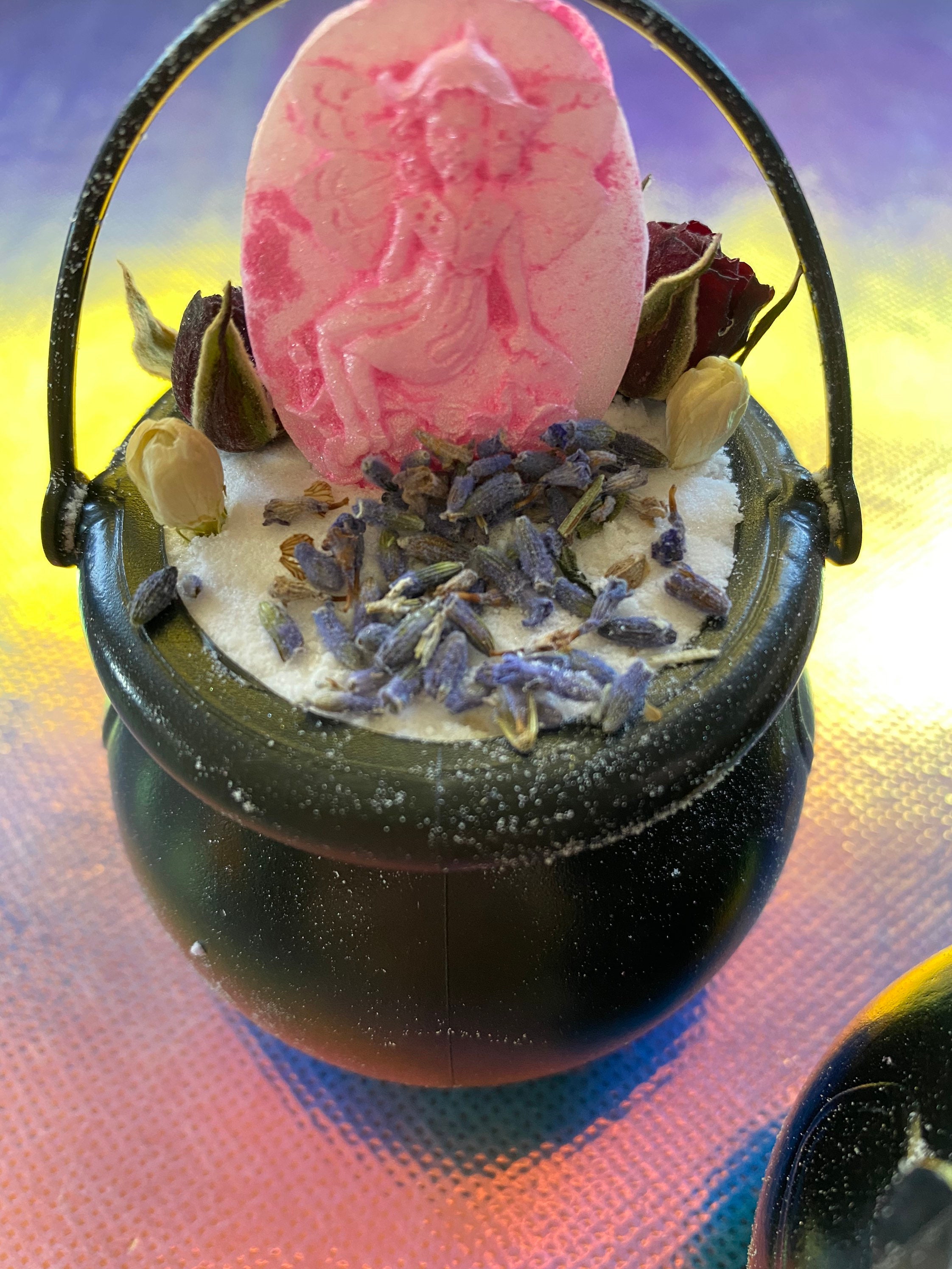 Love-in-Idleness flowers is said to turn white to purple when struck by Cupid’s arrow. This cauldron bath bomb goes from white to purple as you bathe.
